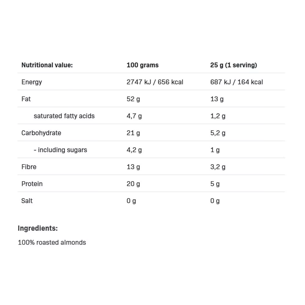 ALLNUTRITION ALMOND CREAM est une tartinade riche en protéines et en fibres. Les protéines sont un nutriment essentiel qui contribue à la croissance et à l’entretien musculaire. L’ALMOND CREAM est également riche en acides gras sains, calcium, potassium, fer et manganèse. Elle constitue une source naturelle de phosphore, cuivre et vitamine E.