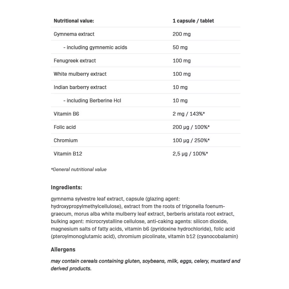 Complément alimentaire. Destiné aux personnes de plus de 18 ans. Ne pas utiliser si vous êtes allergique (hypersensible) à l'un des ingrédients, ou si vous prenez des médicaments (en particulier des médicaments antidiabétiques ou des anticoagulants). Les personnes suivant un traitement à l'insuline ou prenant des agents hypoglycémiants oraux doivent consulter leur médecin avant utilisation. Ne pas utiliser pendant la grossesse ou l'allaitement. Ne pas dépasser la dose quotidienne recommandée. Les compléments alimentaires ne doivent pas être utilisés comme substitut à une alimentation variée. Une alimentation variée et équilibrée ainsi qu'un mode de vie sain sont importants. Toujours bien refermer l'emballage après utilisation.