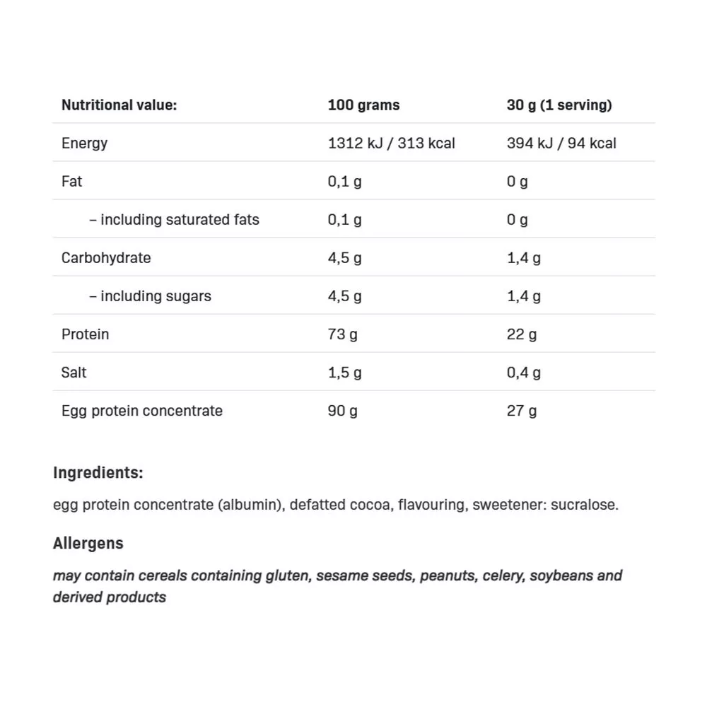 EGG WHITE PROTEIN est un complément de haute qualité à base de concentré de blanc d'œuf – une excellente alternative aux compléments classiques de protéines de lactosérum. Grâce à sa