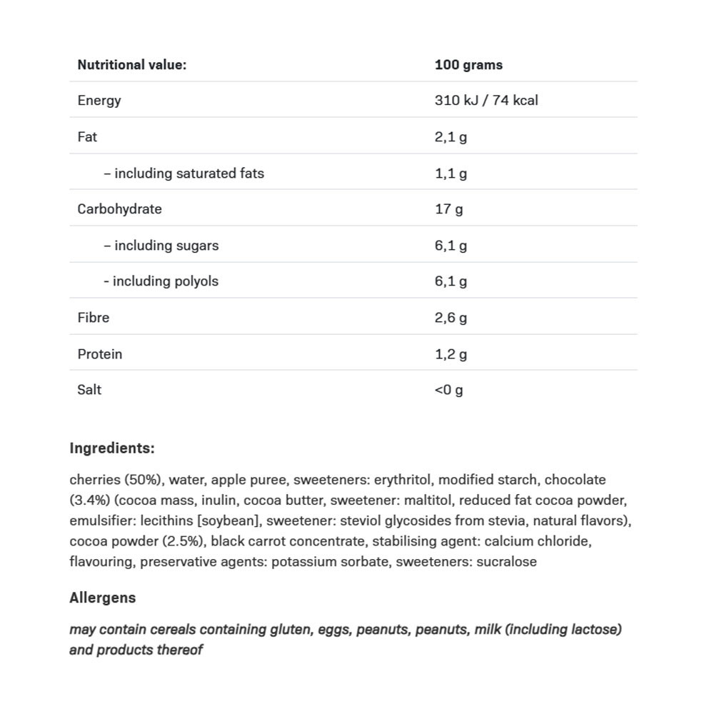 ALLNUTRITION Choco In Jelly Cherry crée la parfaite combinaison entre le chocolat sucré et le goût acidulé et légèrement aigre des cerises. Grâce à sa saveur distinctive et originale, il vous comblera plus longtemps. La série FRULOVE va de votre estomac droit à votre cœur – et vous pouvez la partager avec vos proches.