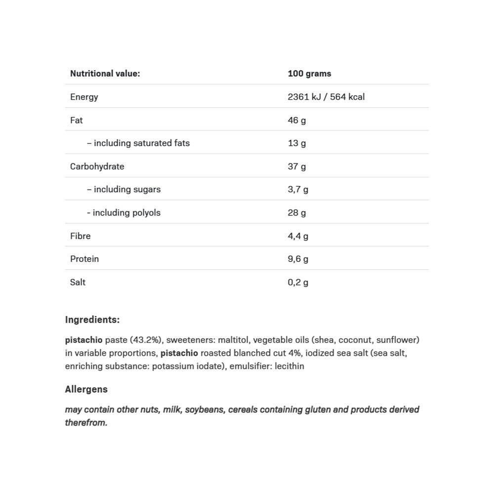Crème de pistache avec morceaux de pistache. Contient un édulcorant. Sans sucres ajoutés. Contient des sucres naturellement présents. Ne convient pas aux personnes allergiques (hypersensibilité). Une consommation excessive peut avoir un effet laxatif. Peut contenir d'autres fruits à coque, du lait, du soja, des céréales contenant du gluten et leurs dérivés. Date de durabilité minimale / numéro de lot : voir couvercle. La couleur ou la texture peut changer pendant le stockage, ce qui n'affecte pas la qualité. Bien mélanger avant consommation.