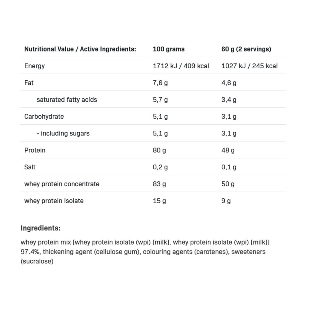 Contient des sucres naturellement présents. Ce produit est destiné aux personnes physiquement actives de plus de 18 ans. Ne pas utiliser si vous êtes allergique à l’un des ingrédients. Ce produit ne doit pas être utilisé par les femmes enceintes ou allaitantes. Ne pas dépasser la dose quotidienne recommandée. Ce complément alimentaire ne doit pas être utilisé comme substitut à une alimentation variée. Une alimentation équilibrée et un mode de vie sain sont recommandés. E104, E124 – peuvent avoir des effets indésirables sur l’activité et l’attention chez les enfants. La teneur en protéines du produit est indiquée sur matière sèche.