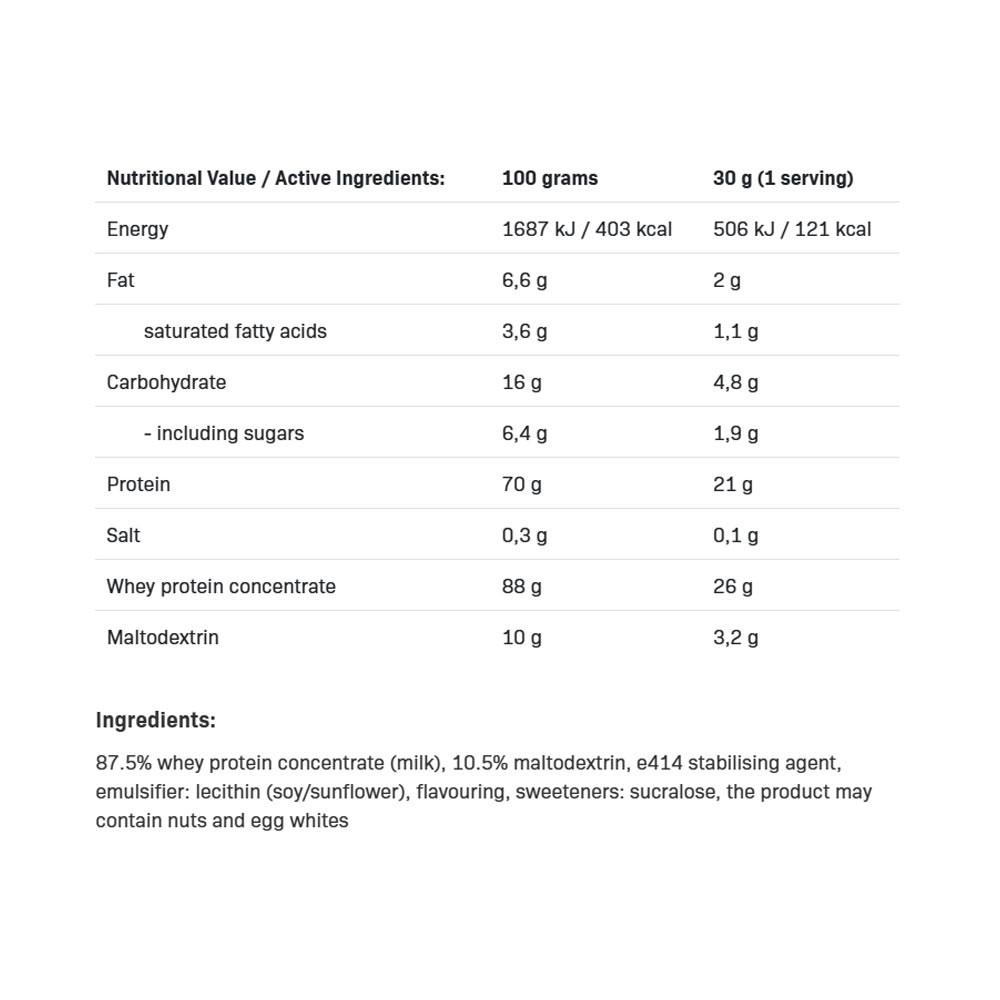 WHEY PROTEIN peut être consommée à tout moment de la journée, sous n’importe quelle forme – elle peut être préparée rapidement et facilement en shake avec de l’eau ou du lait. Elle est également parfaite en complément de vos flocons d’avoine, œufs brouillés ou autres plats.