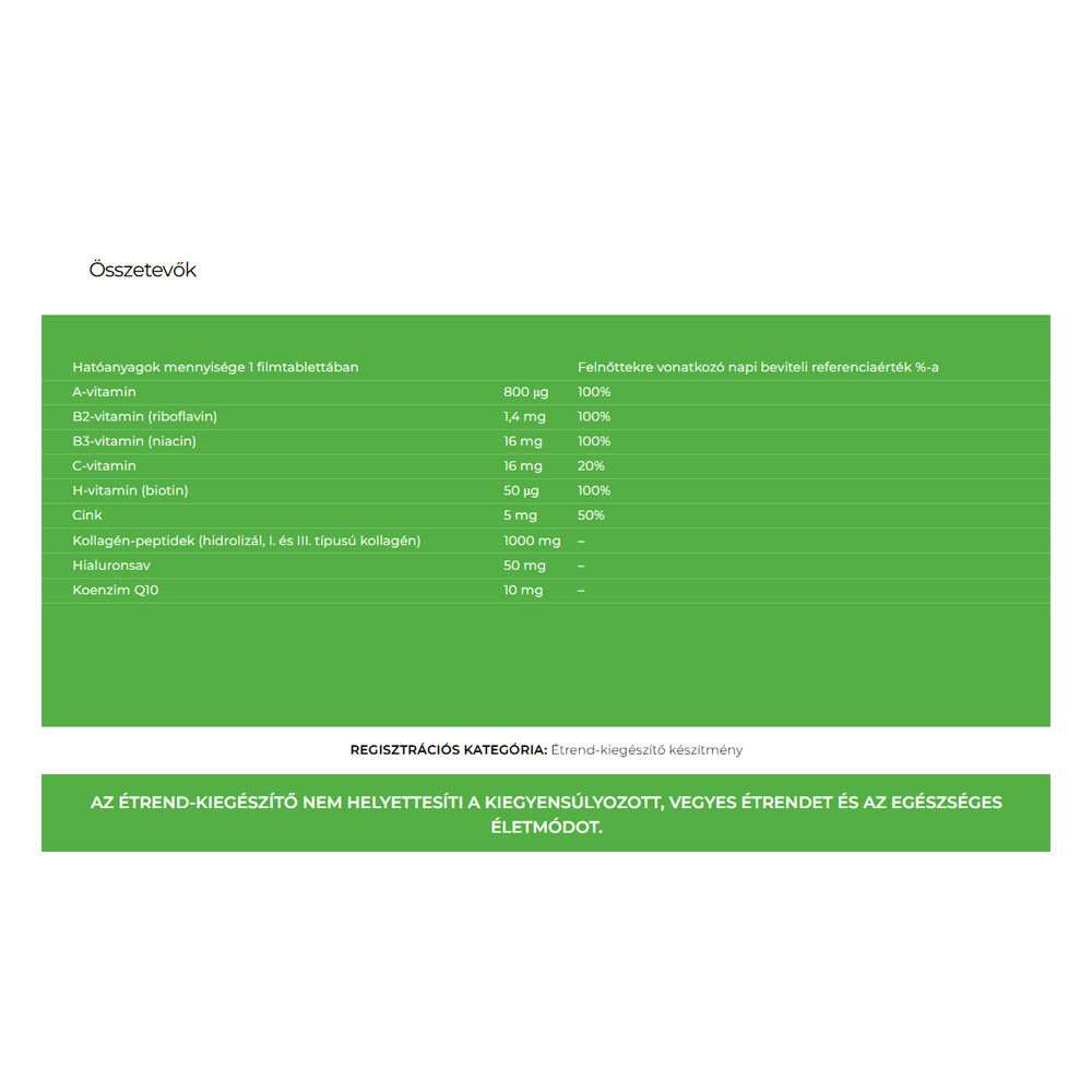 Sans lactoseBéres Collagène–Acide Hyaluronique, complément alimentaire en comprimés pelliculés contenant du collagène hydrolysé, de l’acide hyaluronique, de la coenzyme Q10, du zinc et des vitamines Beauty Complex.