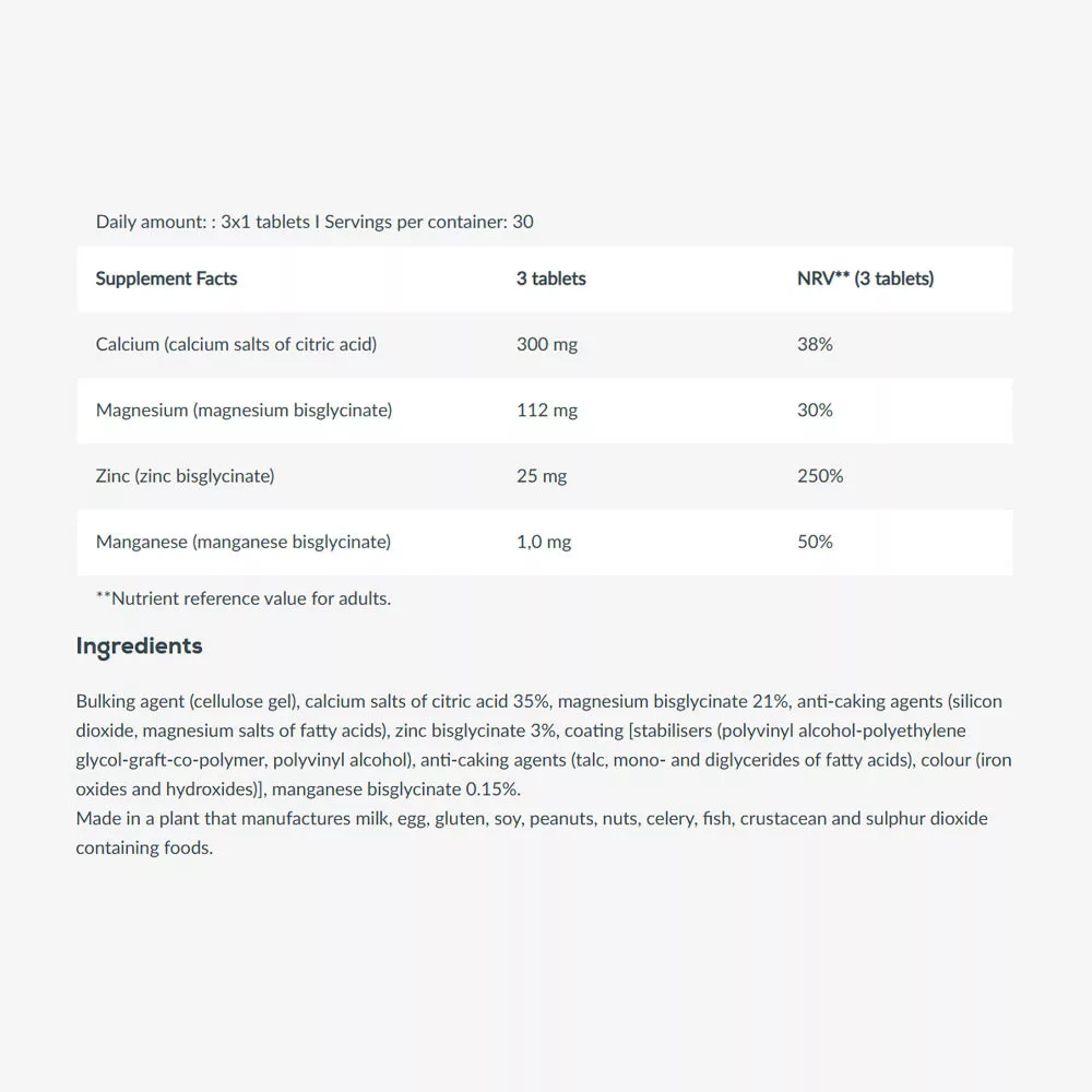 Une combinaison soigneusement sélectionnée de calcium, de zinc et de magnésium sous forme organique pour soutenir les os, les muscles et le système immunitaire