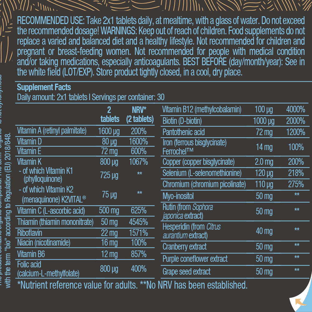 • CHEVEUX SAINS & PEAU ÉCLATANTE : Des ingrédients tels que la vitamine A, la riboflavine et la biotine aident à maintenir une peau saine, tandis que la niacine soutient l’état naturel de la peau. Le cuivre contribue à la pigmentation normale des cheveux et de la peau et soutient le maintien d’un tissu conjonctif normal. La biotine, le sélénium et le zinc favorisent la santé des cheveux.