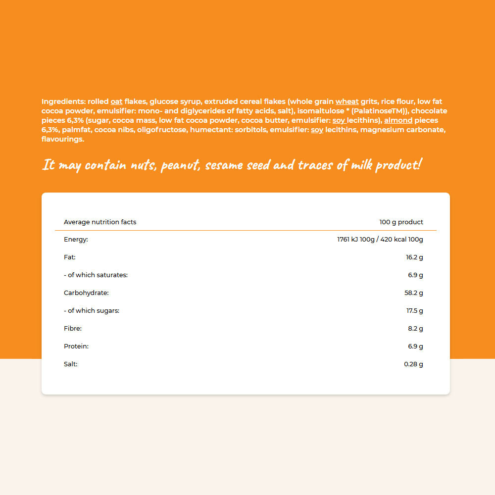 Ingrédients : flocons d’avoine, sirop de glucose, flocons de céréales extrudés (semoule de blé complet, farine de riz, poudre de cacao maigre, émulsifiant : mono- et diglycérides d’acides gras, sel), isomaltulose (Palatinose™), morceaux de chocolat 6,3 % (sucre, pâte de cacao, poudre de cacao maigre, beurre de cacao, émulsifiant : lécithines de soja), éclats d’amandes 6,3 %, graisse de palme, éclats de fèves de cacao, oligofructose, agent humectant : sorbitols, émulsifiant : lécithines de soja, carbonate de magnésium, arômes.