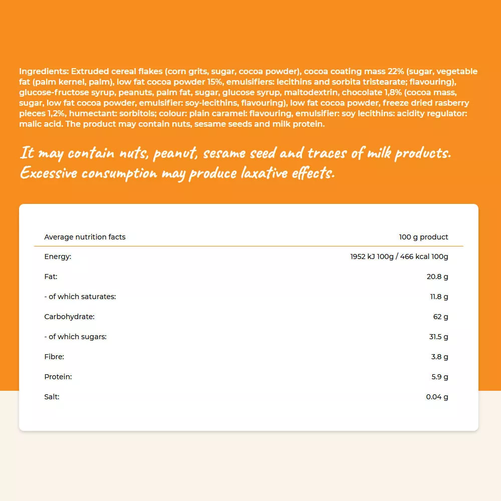 Ingrédients : Flocons de céréales extrudés (semoule de maïs, sucre, poudre de cacao), masse d’enrobage au cacao 22 % (sucre, matières grasses végétales (palmiste, palme), poudre de cacao maigre 15 %, émulsifiants : lécithines et tristearate de sorbitane arôme), sirop de glucose-fructose, cacahuètes, graisse de palme, sucre, sirop de glucose, maltodextrine, chocolat 1,8 % (pâte de cacao, sucre, poudre de cacao maigre, émulsifiant : lécithines de soja, arôme), poudre de cacao maigre, morceaux de framboises lyophilisées 1,2 %, humectant : sorbitols colorant : caramel ordinaire arôme, émulsifiant : lécithines de soja régulateur d’acidité : acide malique. Le produit peut contenir des fruits à coque, des graines de sésame et des protéines de lait.