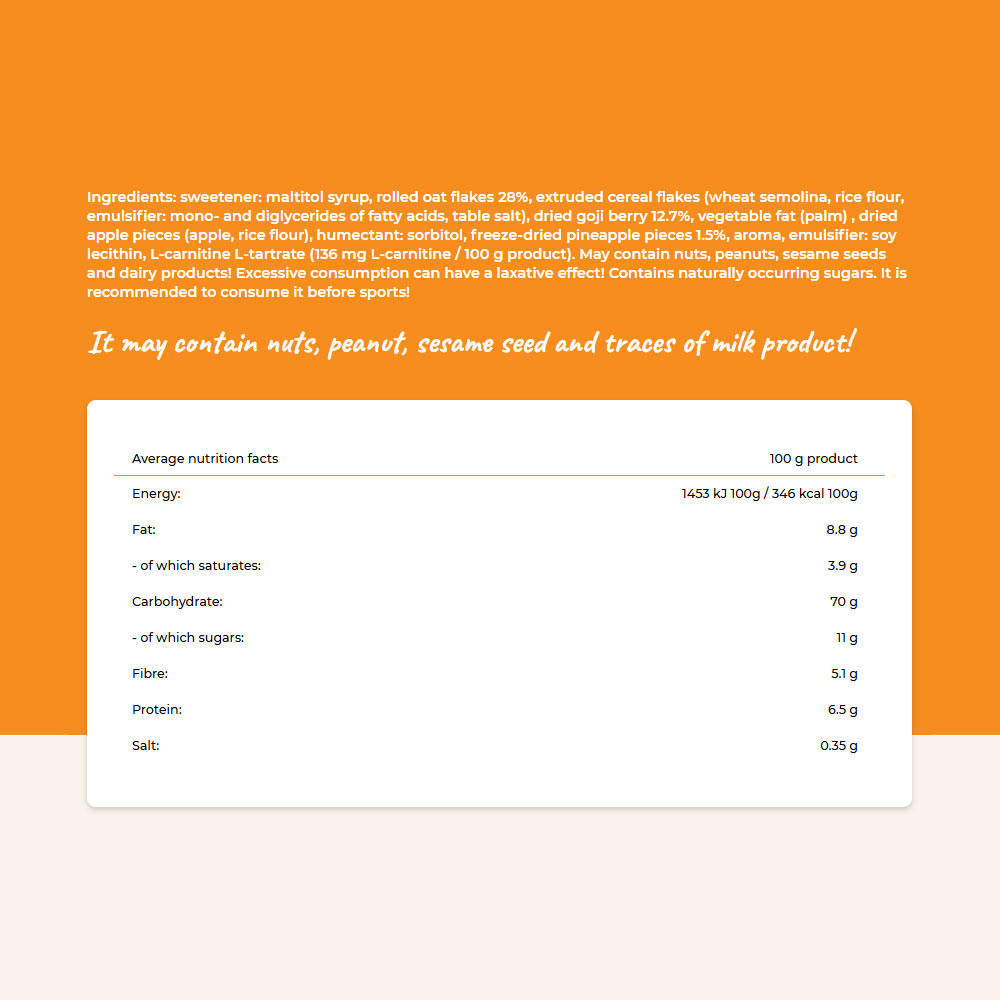 Ingrédients : édulcorant : sirop de maltitol, flocons d’avoine roulée 28%, flocons de céréales extrudés (semoule de blé, farine de riz, émulsifiant : mono- et diglycérides d’acides gras, sel de table), baies de goji séchées 12,7%, matière grasse végétale (palme), morceaux de pomme séchée (pomme, farine de riz), humectant : sorbitol, morceaux d’ananas lyophilisés 1,5%, arôme, émulsifiant : lécithine de soja, L-carnitine L-tartrate (136 mg de L-carnitine / 100 g de produit). Peut contenir des fruits à coque, des arachides, des graines de sésame et des produits laitiers ! Une consommation excessive peut avoir un effet laxatif ! Contient des sucres naturellement présents. Il est recommandé de la consommer avant le sport !