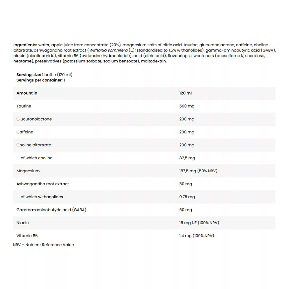 Complément alimentaire. Boisson énergisante. Pasteurisé. Avec édulcorants. Contient de la caféine (200 mg / portion de 120 ml 166,7 mg / 100 ml), Non recommandé pour les enfants ni les femmes enceintes. Complément alimentaire liquide avec une saveur de raisin-poire destiné aux adultes.
