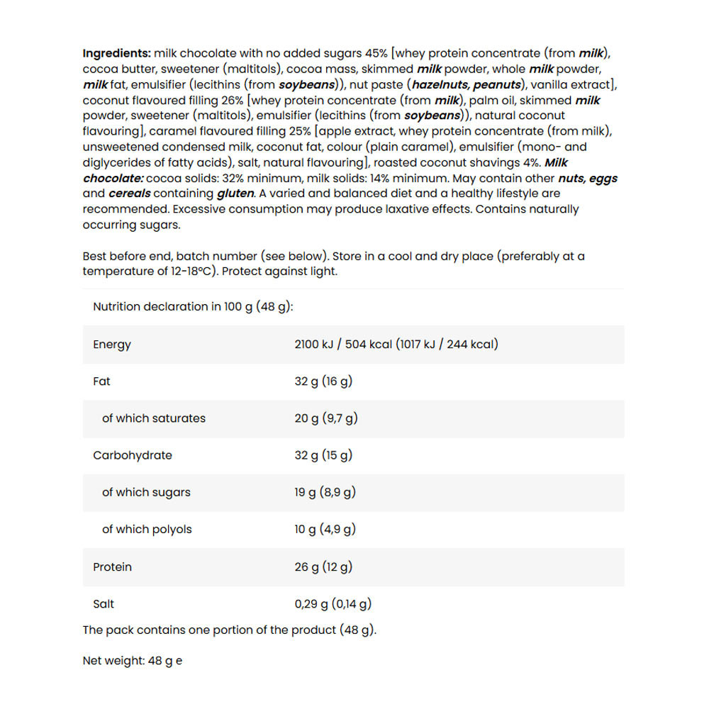 Ingrédients : chocolat au lait sans sucres ajoutés 45 % [concentré de protéines de lactosérum (à base de lait), beurre de cacao, édulcorant (maltitols), pâte de cacao, lait écrémé en poudre, lait entier en poudre, matière grasse laitière, émulsifiant (lécithines (à base de soja)), pâte de noix (noisettes, cacahuètes), extrait de vanille], garniture aromatisée à la vanille 30 % [concentré de protéines de lactosérum (à base de lait), huile de palme, lait écrémé en poudre, édulcorant (maltitols), émulsifiant (lécithines (à base de soja)), extrait de vanille], garniture aromatisée au caramel 25 % [extrait de pomme, concentré de protéines de lactosérum (à base de lait), lait concentré non sucré, graisse de coco, colorant (caramel ordinaire), émulsifiant (mono- et diglycérides d'acides gras), sel, arôme naturel]. Chocolat au lait : cacao : 32 % minimum, extrait sec du lait : 14 % minimum. Peut contenir d'autres fruits à coque, œufs et céréales contenant du gluten. Il est recommandé d'avoir une alimentation variée et équilibrée ainsi qu'un mode de vie sain. Une consommation excessive peut avoir des effets laxatifs. Contient des sucres naturellement présents.UTILISATION (1 portion = 49 g)