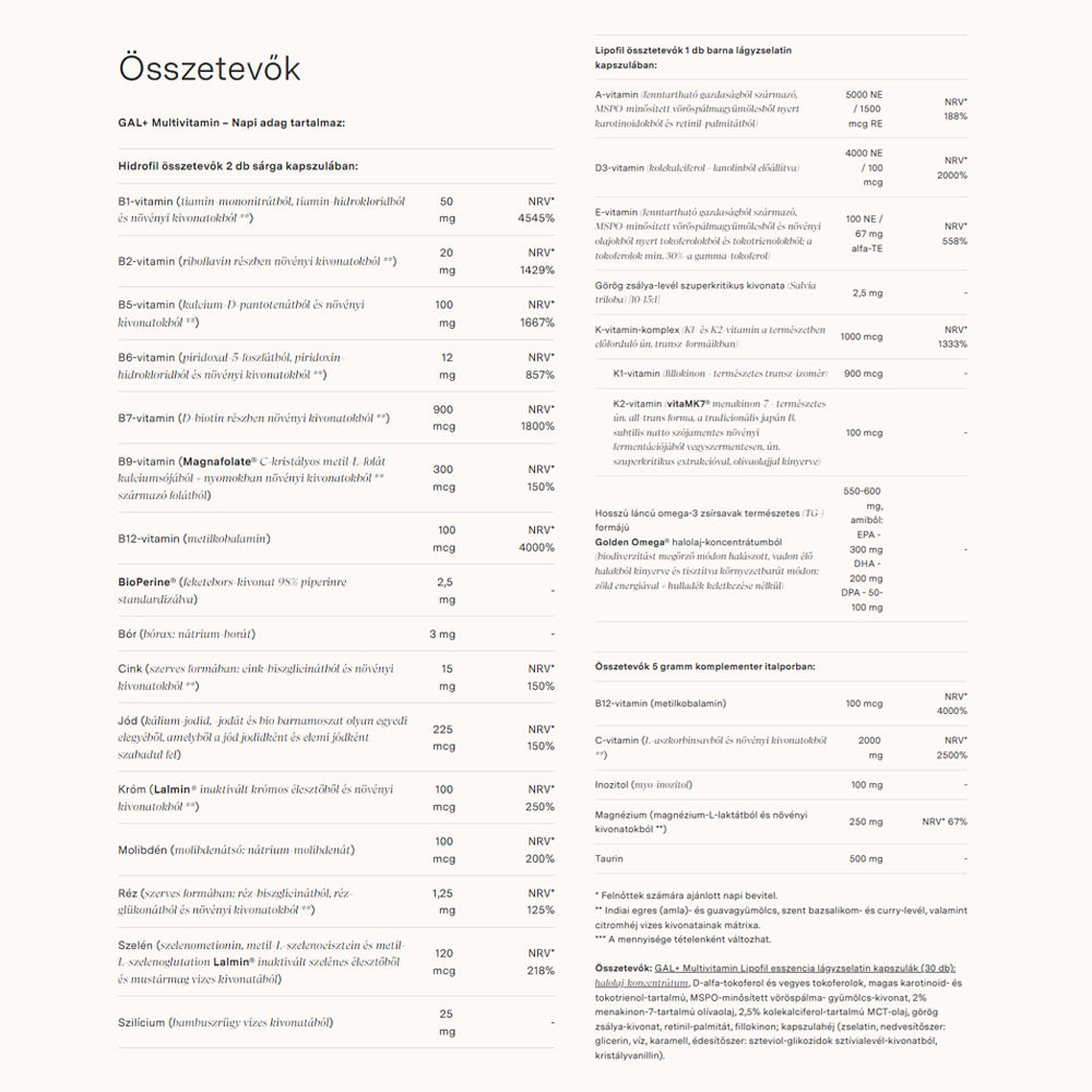 Notre multivitamine GAL+ a été développée à la lumière des recherches les plus récentes, en mettant l’accent sur le naturel et l’équilibre, afin de fournir tous les vitamines, minéraux et oligo-éléments sous des formes, des quantités et des proportions optimales, similaires à celles que l’on pourrait obtenir grâce à une alimentation variée et riche en nutriments. Lorsque cela est bénéfique, les vitamines et minéraux proviennent en partie d’extraits de plantes médicinales et aromatiques issues de l’agriculture biologique. Concernant les dosages, il a toujours été essentiel de garantir que l’apport quotidien contienne des quantités efficaces, sans jamais dépasser des niveaux réalistes, c’est-à-dire des quantités impossibles à atteindre par l’alimentation seule. Il est également primordial que, en plus des matières premières soigneusement sélectionnées, aucun ingrédient inutile ne soit présent. Vous ne trouverez aucune trace de tels éléments dans notre produit.