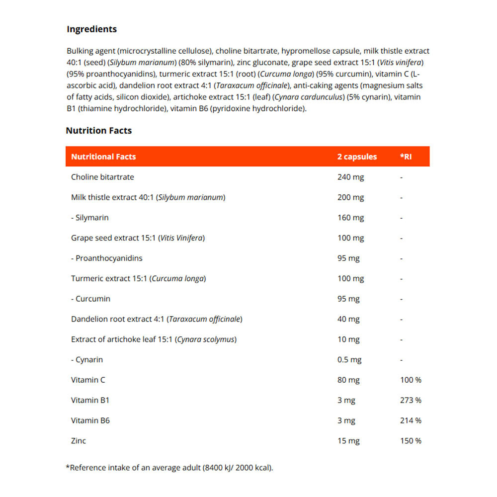 Le Soutien du foie est un complément alimentaire qui aide à prendre soin de la santé. Les ingrédients incluent le bitartrate de choline, une source de choline. Il contribue au maintien d'une fonction hépatique normale, d'un métabolisme normal des lipides et d'un métabolisme normal de l'homocystéine. On y trouve également un extrait de chardon-marie. En même temps, l'extrait de pépins de raisin, le pissenlit, la feuille d'artichaut et le curcuma sont également inclus dans la formule.
