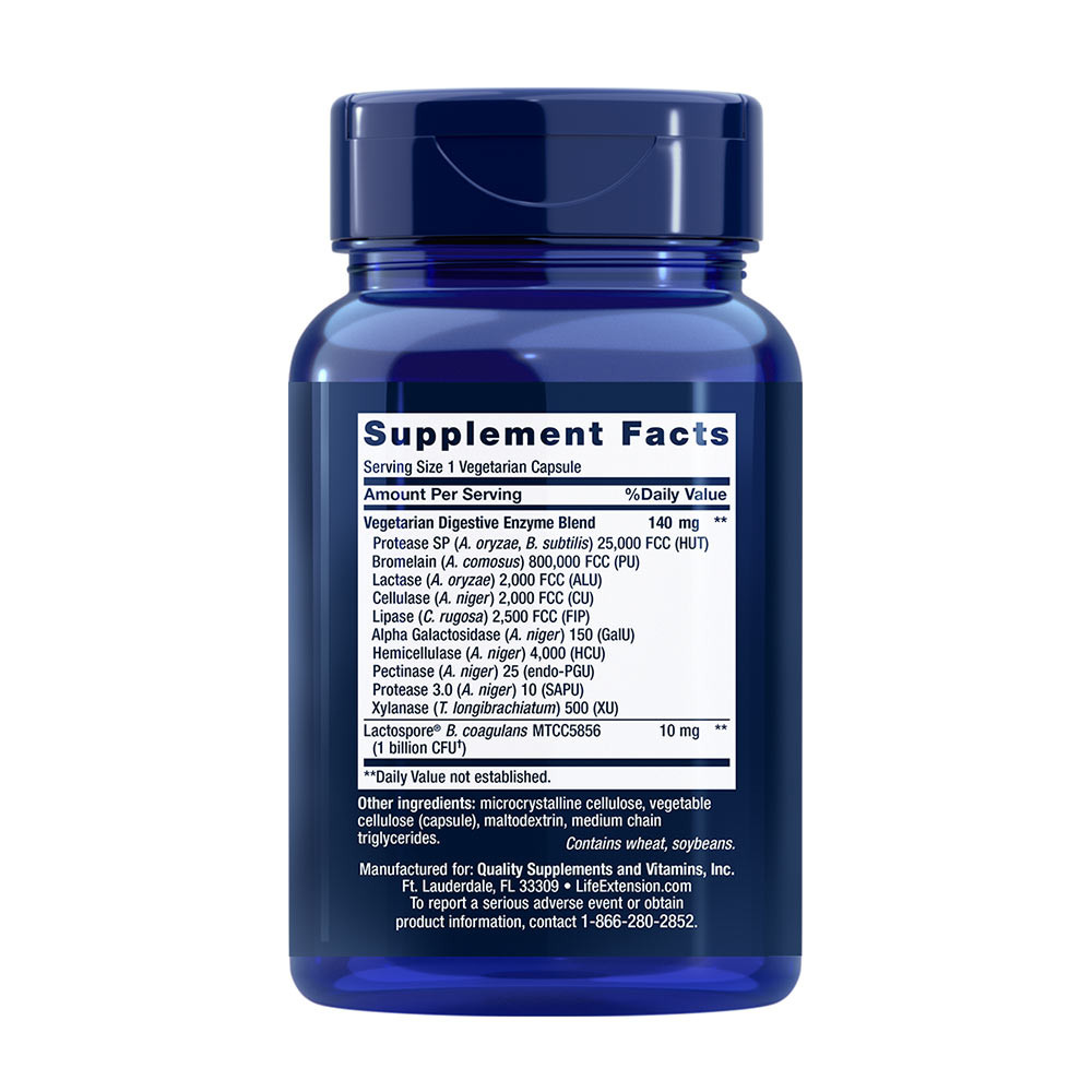 Life Extension Digestive Enzymes and Probiotics contient 10 enzymes végétariennes et le probiotique B. coagulans pour soutenir l'équilibre gastro-intestinal, décomposer les régimes à base de plantes et digérer les macros comme les protéines, les produits laitiers et les graisses.