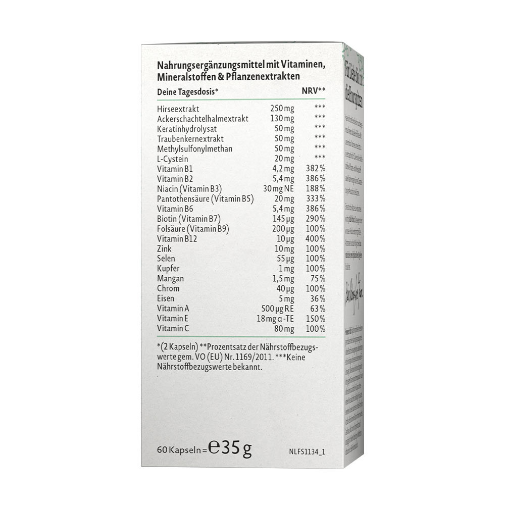 Sans lactoseLes cheveux sont vraiment sensibles et réagissent aussi bien aux influences internes qu’externes. Avec nos Vitamines pour Cheveux, vous pouvez désormais les soutenir de manière holistique : 23 précieux alliés beauté tels que des extraits de plantes, minéraux et vitamines garantissent des résultats éclatants de la racine à la pointe. La formule contient de la kératine, la protéine qui compose naturellement la couche kératinique de vos cheveux et joue un rôle clé dans leur structure et leur apparence. On y trouve également de la L-cystéine, un composant naturel de la kératine – car deux, c’est mieux qu’un. Bien sûr, nous incluons aussi de la biotine, connue sous le nom de « vitamine des cheveux » ou « vitamine beauté ». Sans oublier le sélénium et le zinc pour protéger contre le stress oxydatif, ainsi que le cuivre, qui adore votre couleur naturelle de cheveux. Vous en voulez encore plus ? 17 ingrédients supplémentaires œuvrent chaque jour pour la splendeur de vos cheveux – le tout à haute dose. Hourra !