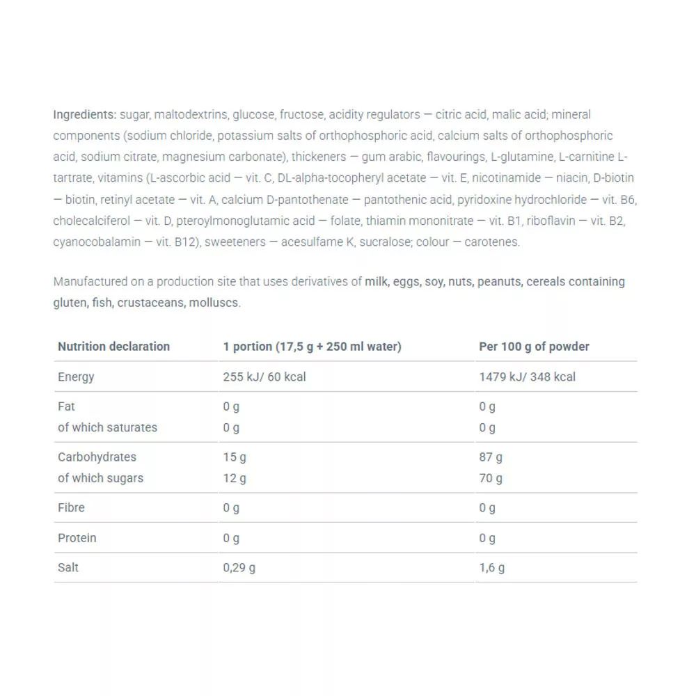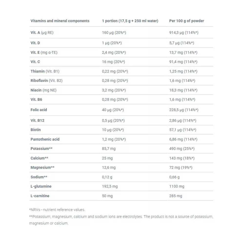 1 portion par jour pendant l'entraînement. Dissoudre 1 portion (17,5 g de poudre = 1½ dose) dans 250 ml d'eau, utiliser un shaker pendant au moins 10 secondes.