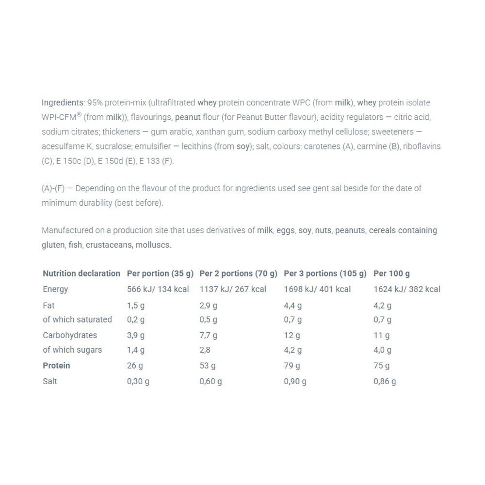 Complément alimentaire. Concentré de protéines en poudre à haute teneur en protéines. Avec édulcorants. Mélange de concentré de protéines de lactosérum ultrafiltré de haute qualité et d’isolat de protéines de lactosérum. Le produit est conçu pour les personnes physiquement actives et les sportifs, qui cherchent à développer leur masse musculaire.