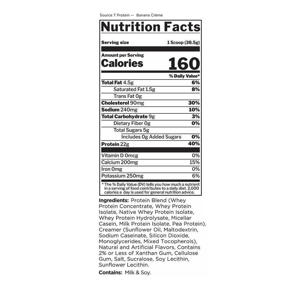 Mélangez environ une dose de Source 7 Protein avec 200-250 ml (6-8 oz) d'eau froide, de lait, ou de votre boisson préférée dans un blender, un shaker ou un verre avec une cuillère. Pour plus de variété, mélangez avec des fruits ou incorporez dans des céréales ou du yaourt.