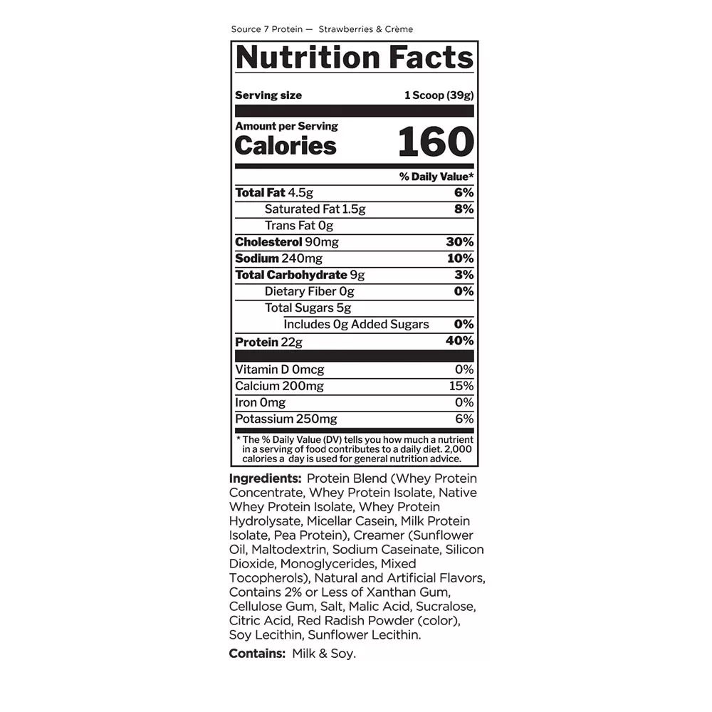 Source 7 Protéine combine sept sources de protéines premium dans chaque shake ultra-crémeux et extra-gourmand. Le goût exceptionnellement bon est complété par une facilité de mélange et 22 grammes de protéine de haute qualité par portion. C’est parfait pour ceux qui entament un parcours protéique ou cherchent un changement délicieux par rapport à la dose habituelle, Source 7 Protéine est un excellent ajout à toute heure — ou tout le temps — à un mode de vie actif.
