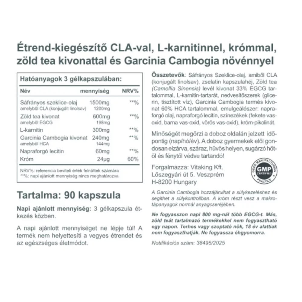 Un mode de vie conscient ne consiste pas à se priver, mais à accorder une attention constante à soi-même. Vitaking Fat Burner contient des ingrédients naturels qui peuvent aider votre alimentation saine et l'exercice régulier à offrir de véritables résultats visibles. L’association harmonieuse de CLA, L-carnitine, chrome, extrait de thé vert et Garcinia cambogia accompagne votre corps lorsqu’elle est associée à une alimentation adaptée.