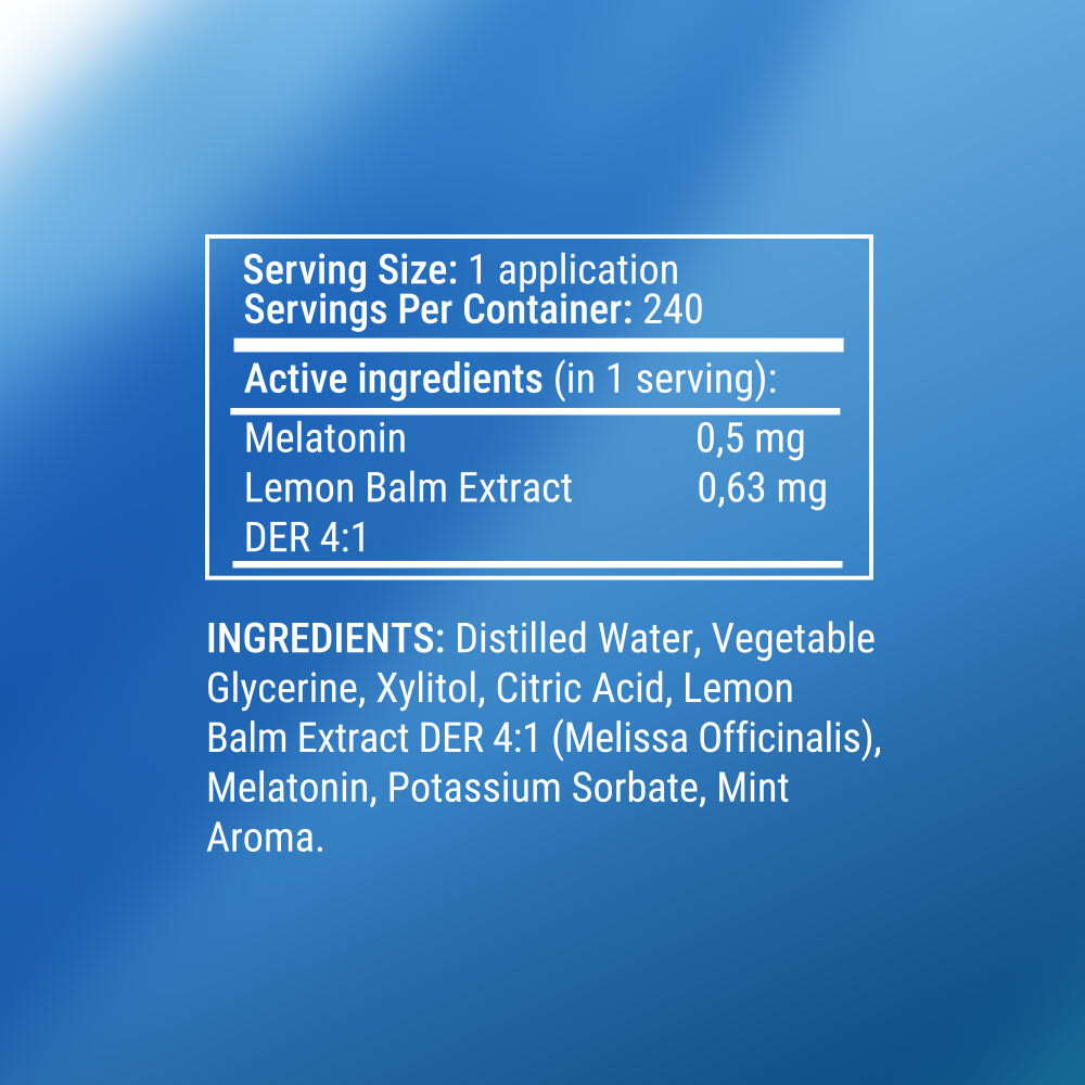 dosage précis. Une pulvérisation délivre 0,5 mg de mélatonine – légèrement au-dessus de la dose minimale efficace identifiée dans les recherches : 0,3 mg.